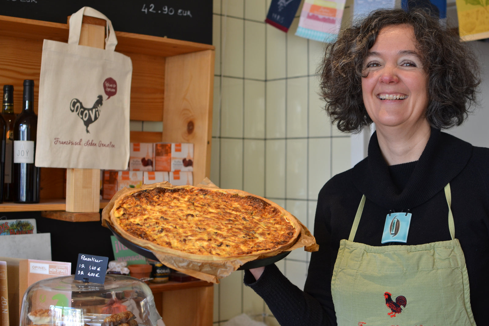 Sie können bei mir im Laden nicht nur mit einem frischen Croissant und einem Grand Crème frühstücken, ich biete auch jede Woche verschiedene Quiches und ein landestypisches Gericht zum sofortigen Verzehr oder zum Mitnehmen an - selbst gemacht versteht sich.